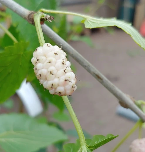 Aus Westasien stammend. In Kleinasien, Südeuropa und Amerika eingebürgert. Dunkelgrüne, unterseits filzig behaarte 6 bis 20 cm lange Blätter. Wächst als kleiner Baum oder Großstrauch, rundliche Krone, dicht und kurz verzweigt. Längliche, ca. 3 cm lange Früchte, weiß- bis rosafarben. Angenehmer, süß-säuerlicher Geschmack. Die weiße Maulbeere ist roh genießbar. Sie reift von Mitte Juli bis Ende September. Für vielfältige Verwendungsmöglichkeiten geeignet. Bevorzugt einen warmen windgeschützten Standort.